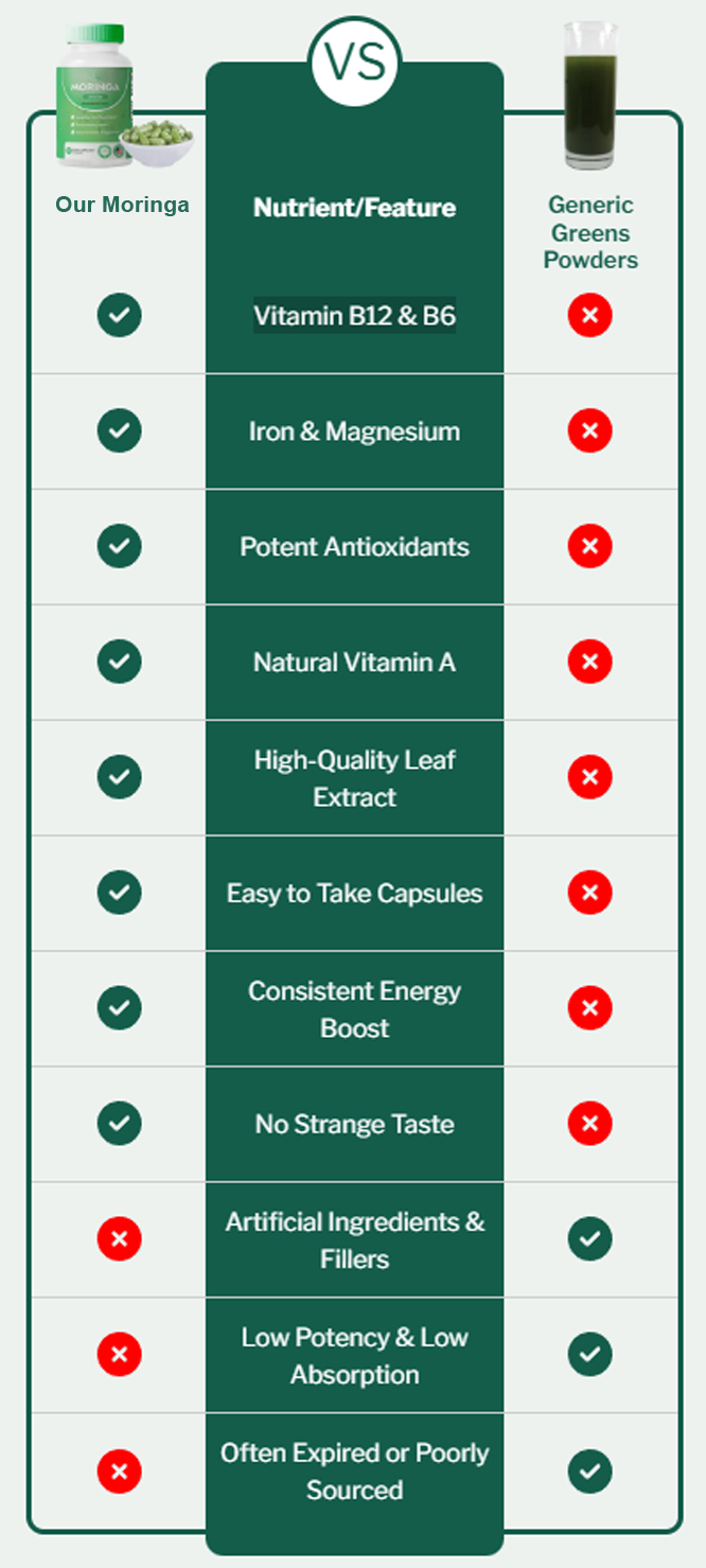 This causes: Low energy, brain fog, irritability, poor sleep, and chronic fatigue. Our Moringa delivers over 90 essential nutrients in their natural, whole-food form helping your body: