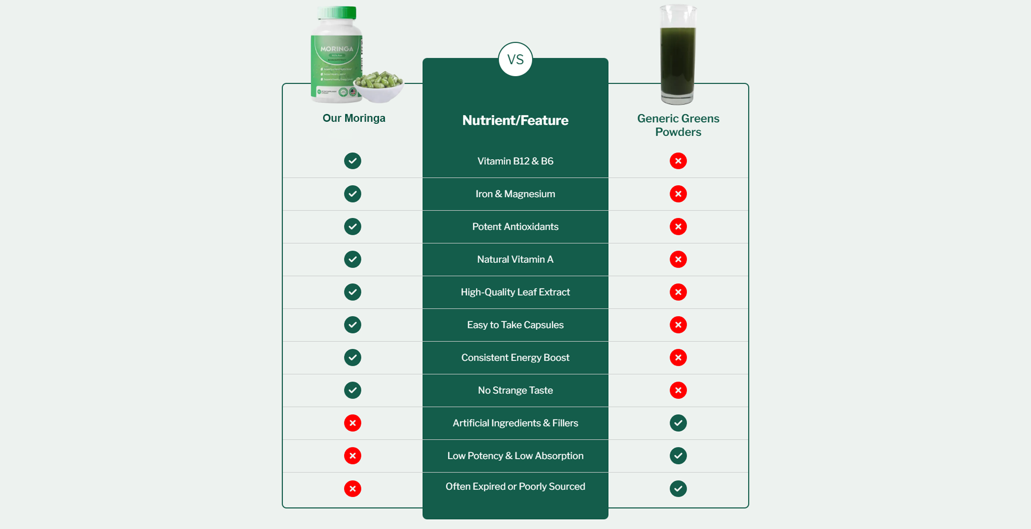 This causes: Low energy, brain fog, irritability, poor sleep, and chronic fatigue. Our Moringa delivers over 90 essential nutrients in their natural, whole-food form helping your body: